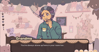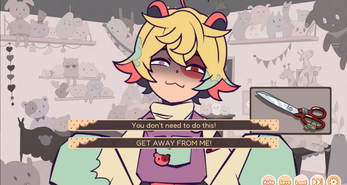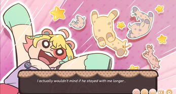 The bg music is leveled out and isn't all different volumes (thumbs up). After looking at the About and Credits, I noticed there were way more tracks than I would have expected for a 30 minute game - I hardly even noticed there were that many while playing. MC's room looks well balanced I think, while still being stuffed (heh) full of plushies to the point there's floor ones *and* ceiling ones. (My eye is also drawn to the random Doric column for a nightstand.)