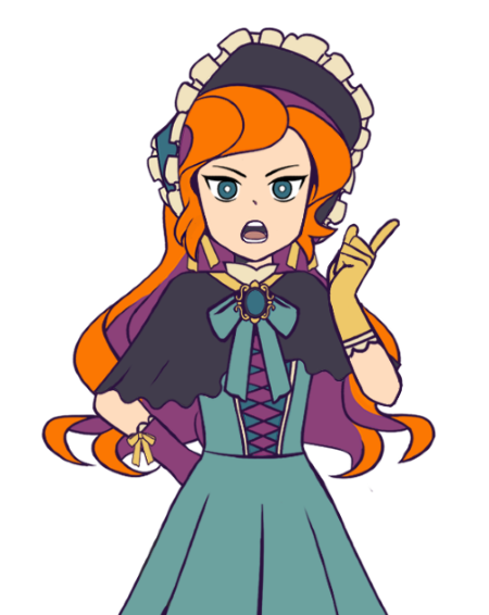 P's design is also something I want to talk about, colors-wise. Having her be monochrome and dark instead of pastel in contrast to the other two, to me, sells the idea "this doesn't belong here". And then you meet her and it turns out she's just a big fan of purple.